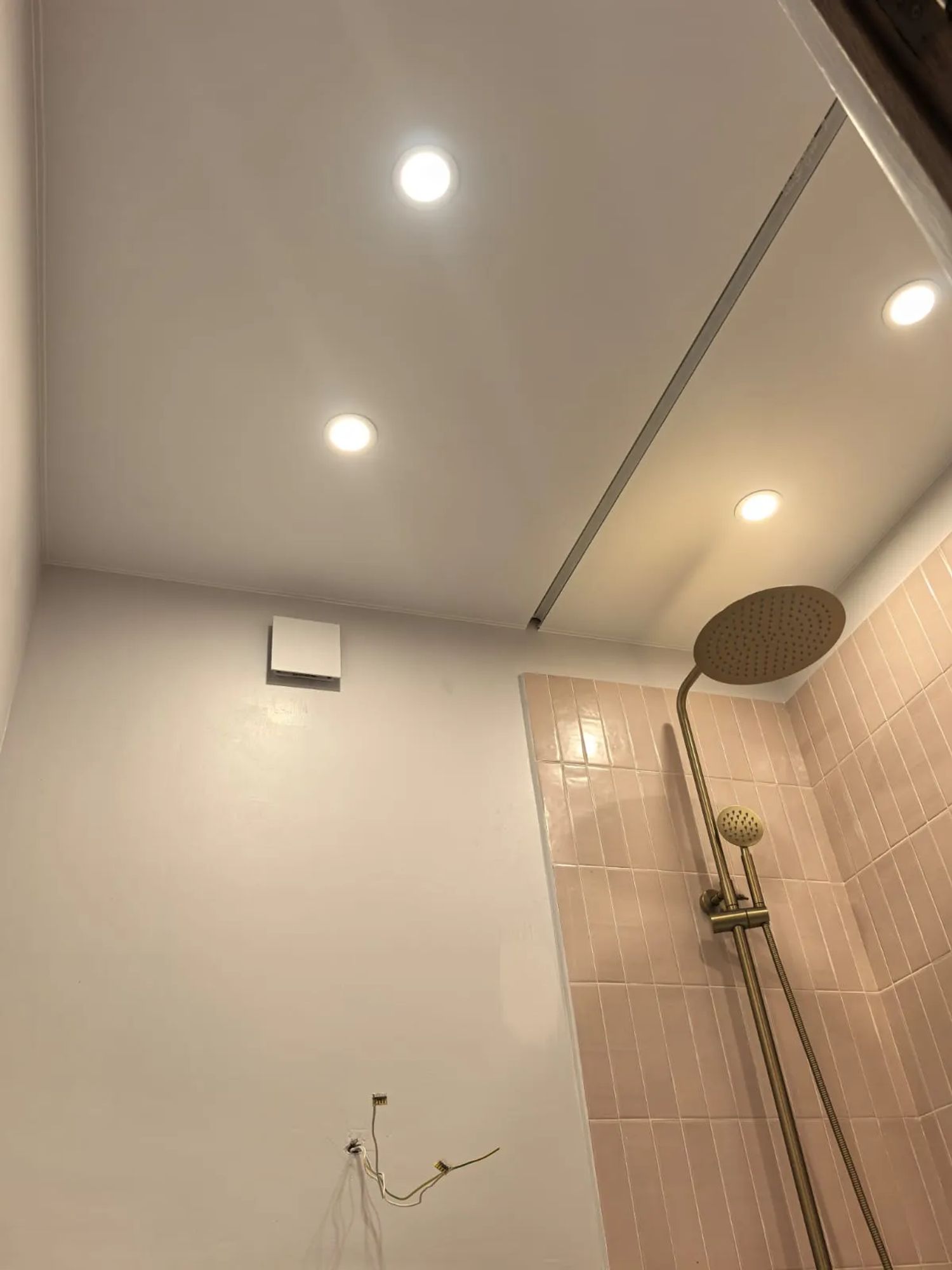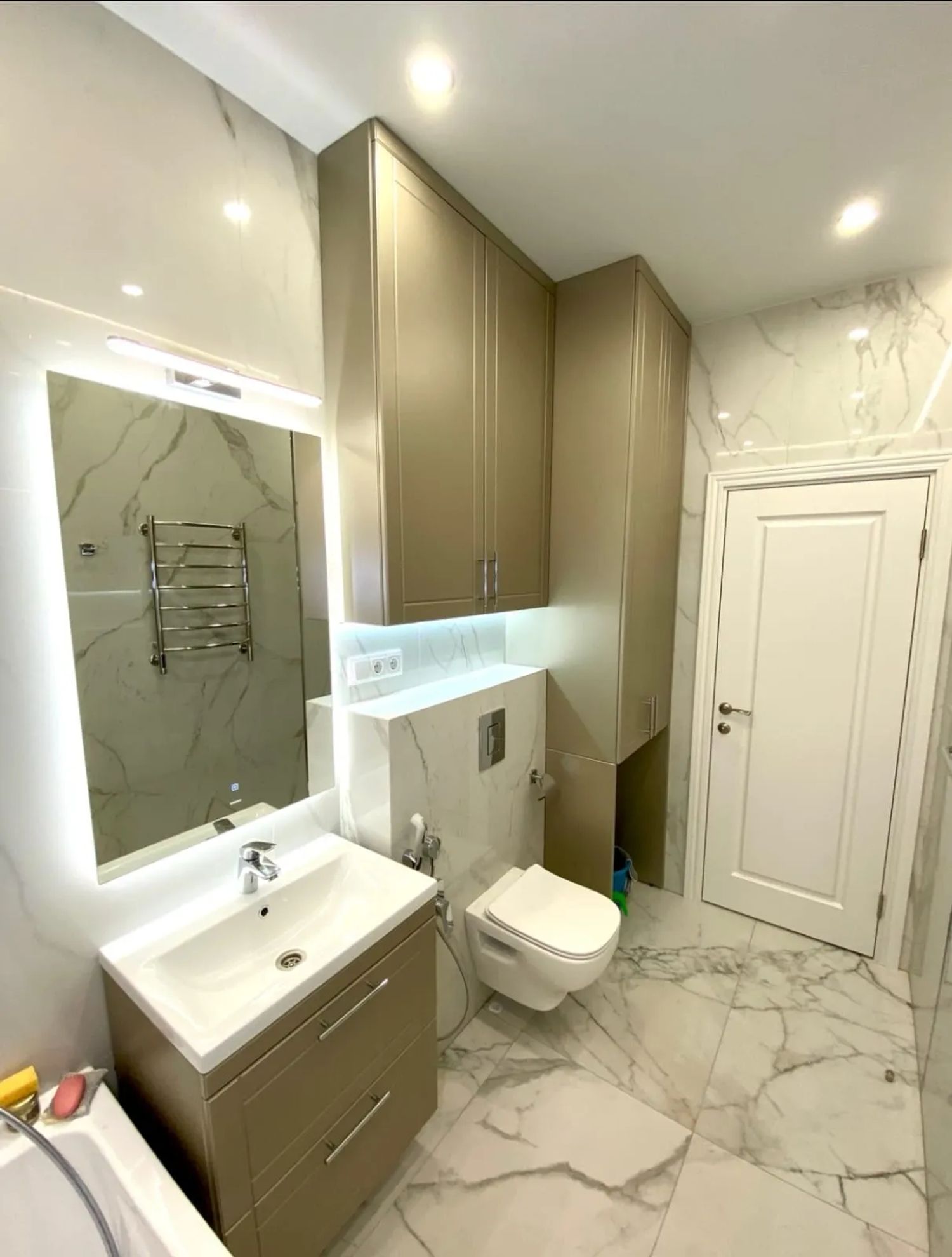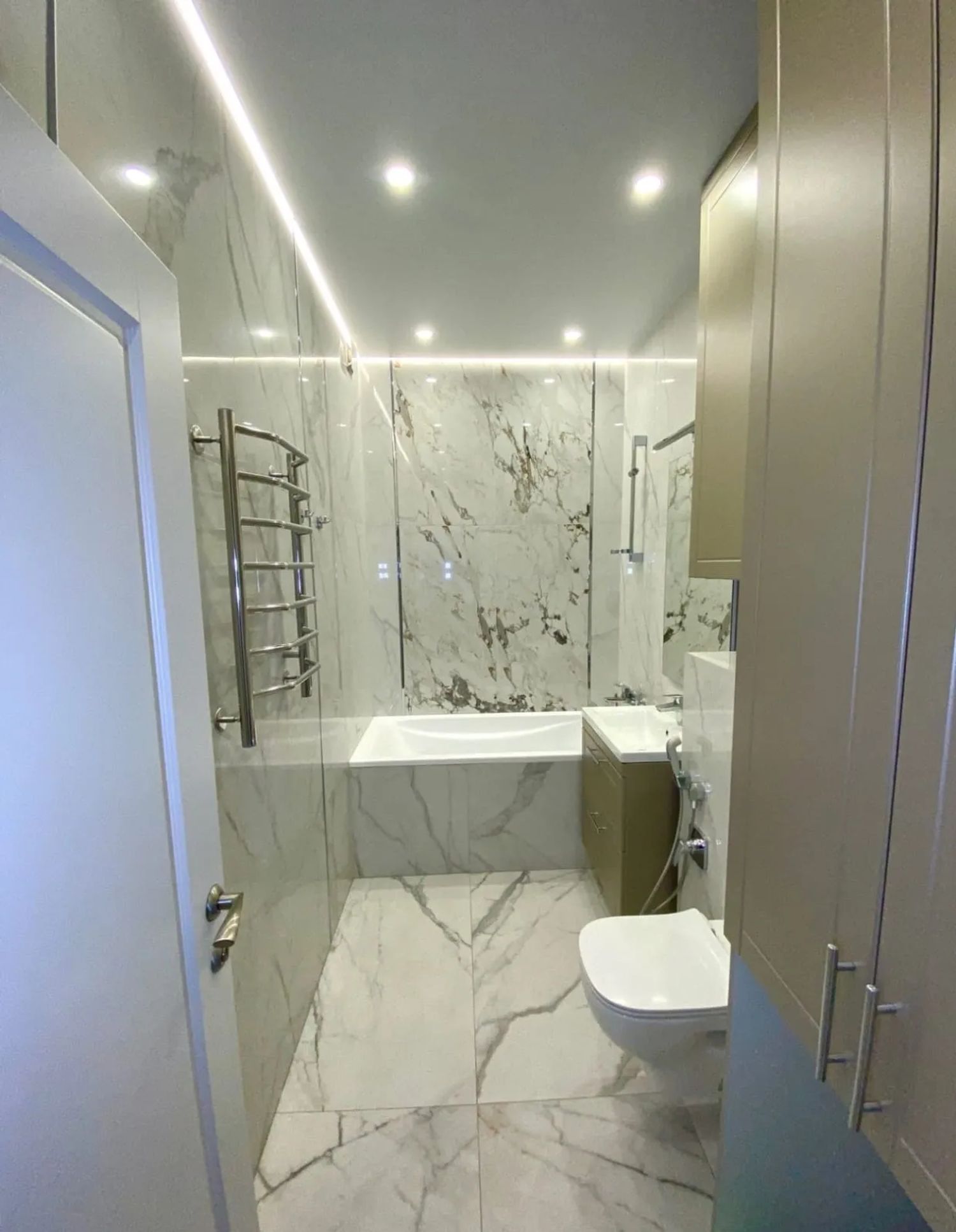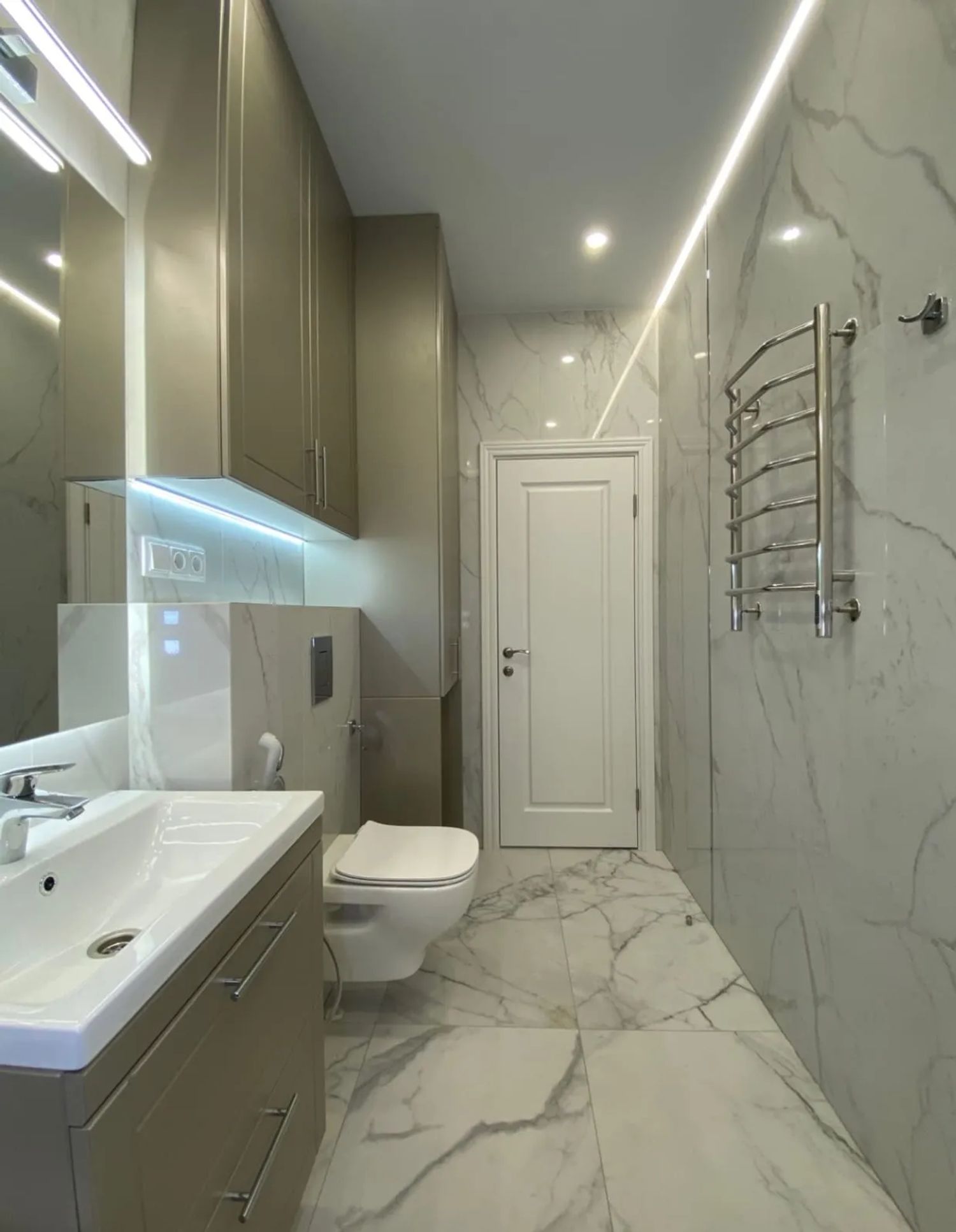 Совмещенный санузел в стиле минимализм с белой плиткой и скрытой сантехникой. Установлена душевая кабина с гидромассажем, система "умный дом" для управления освещением и вентиляцией.