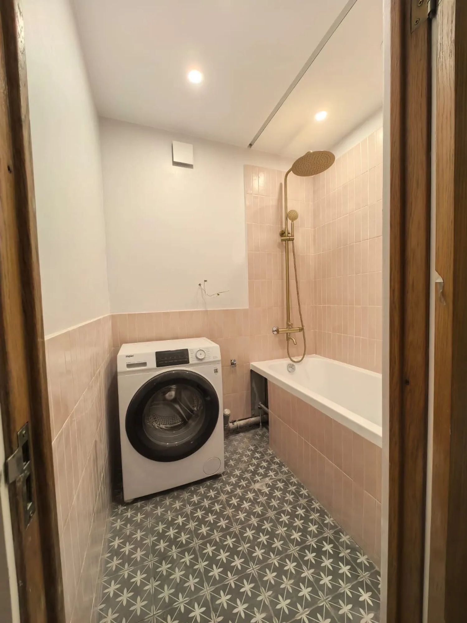 Современный санузел в лофт-стиле с бетонными панелями и черной сантехникой. Установлена душевая зона с подсветкой, стиральная машина скрытого монтажа и система вентиляции.